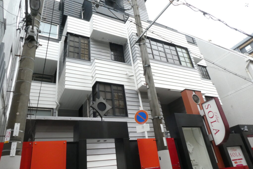 細い路地の向かいに建つ『SOLA』は、外壁が白と黒の板張りでできている。