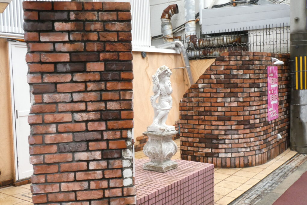 入口付近の壁は煉瓦が敷き詰められ、一角には謎の白い石像がある。