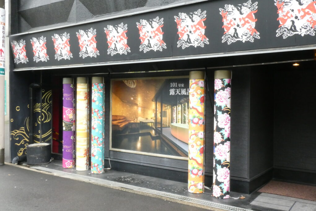入口の一角には、嵐山駅のキモノフォレストのような和服柄のポールが立っている。
