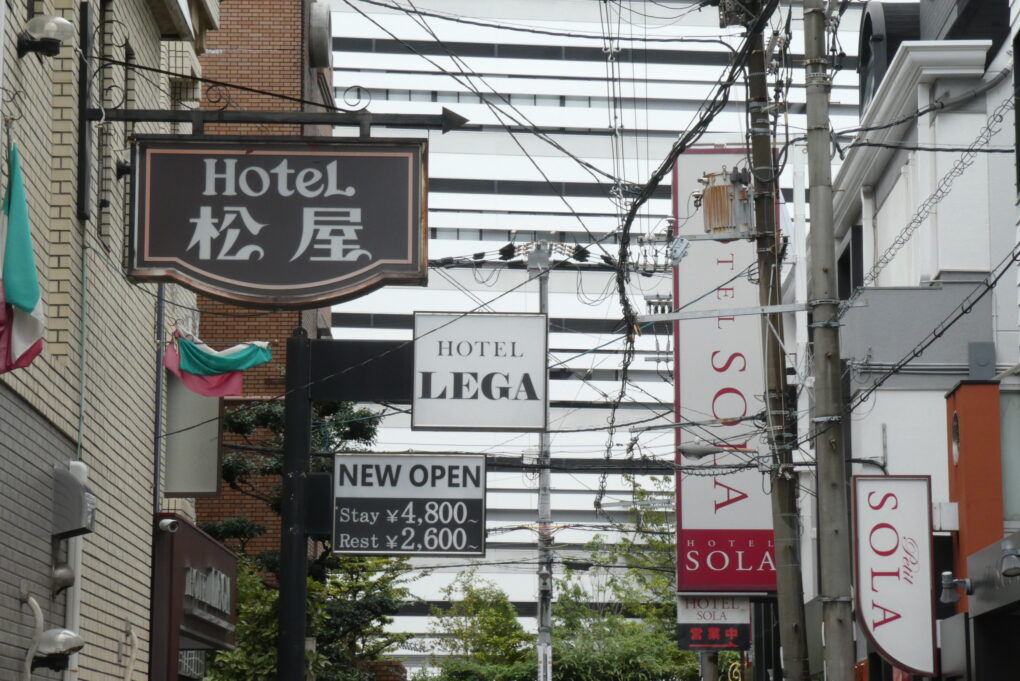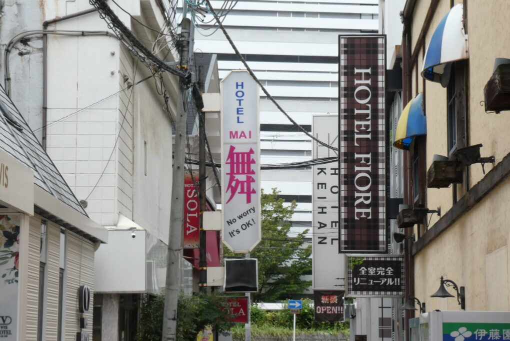 大通りの京阪国道から一本細い道に入ると、ホテルの看板だらけの通りに入る。