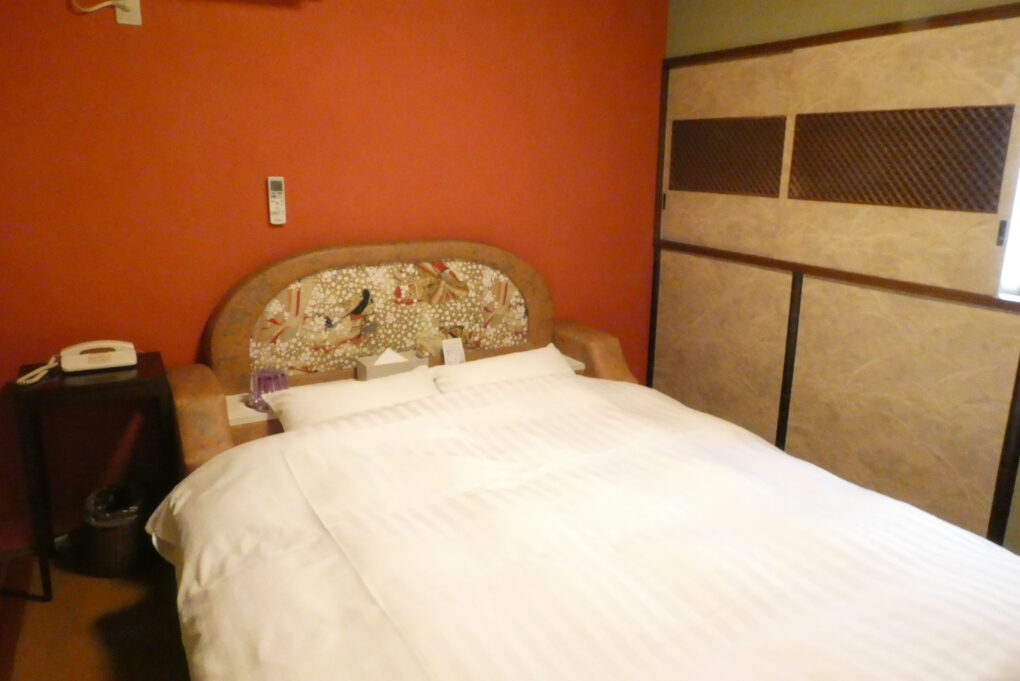 今回は、掘りごたつの居間と印象的なベッドの寝室からなる部屋を訪れた。