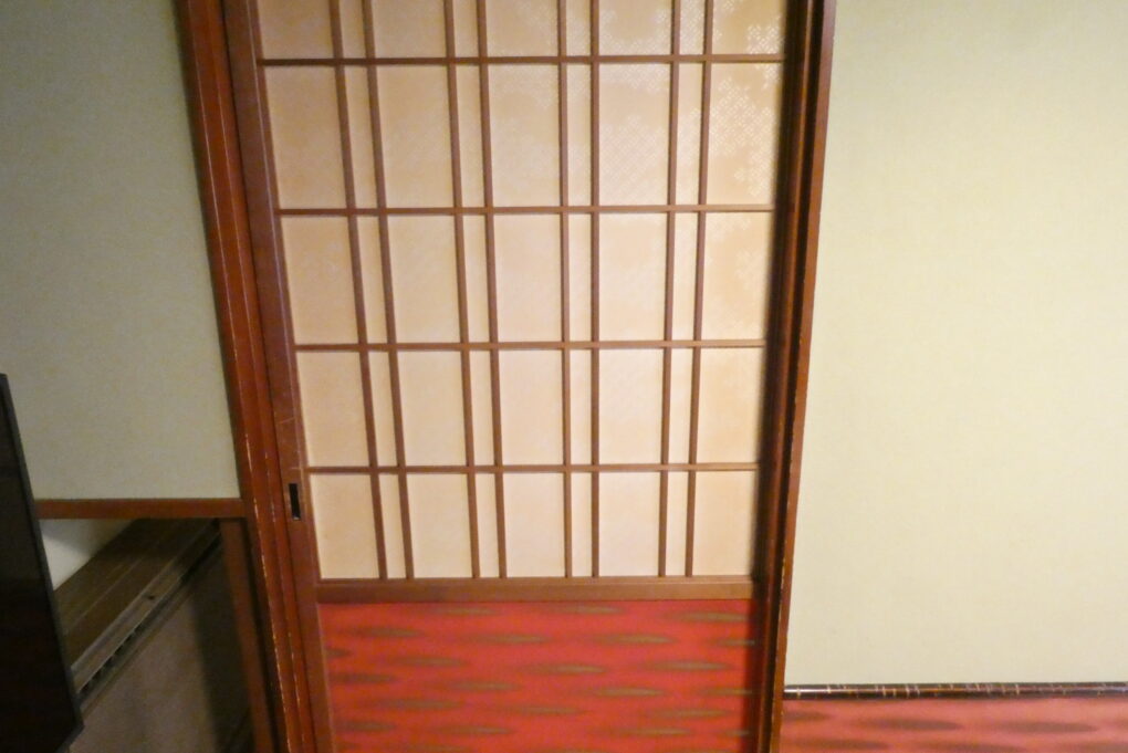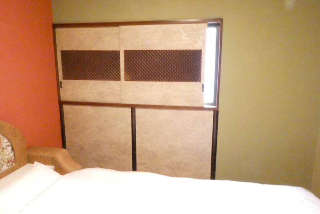 ベッドに横たわると、引き戸の市松模様や木目調の天井が見える。