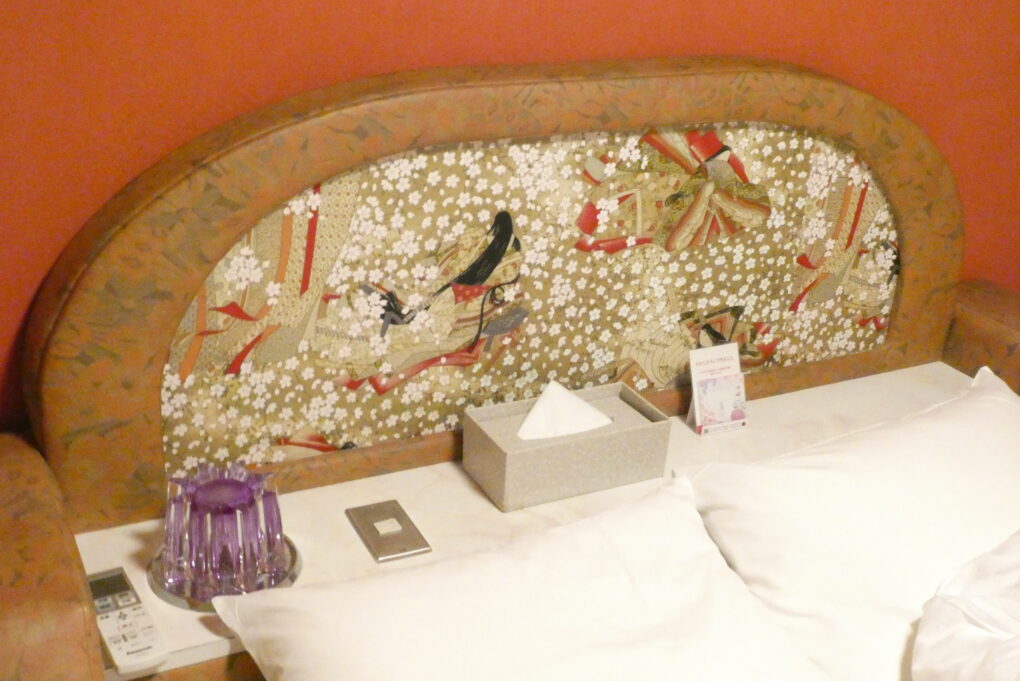 ベッドヘッドには、平安時代の女性を描いた絵が貼られている。