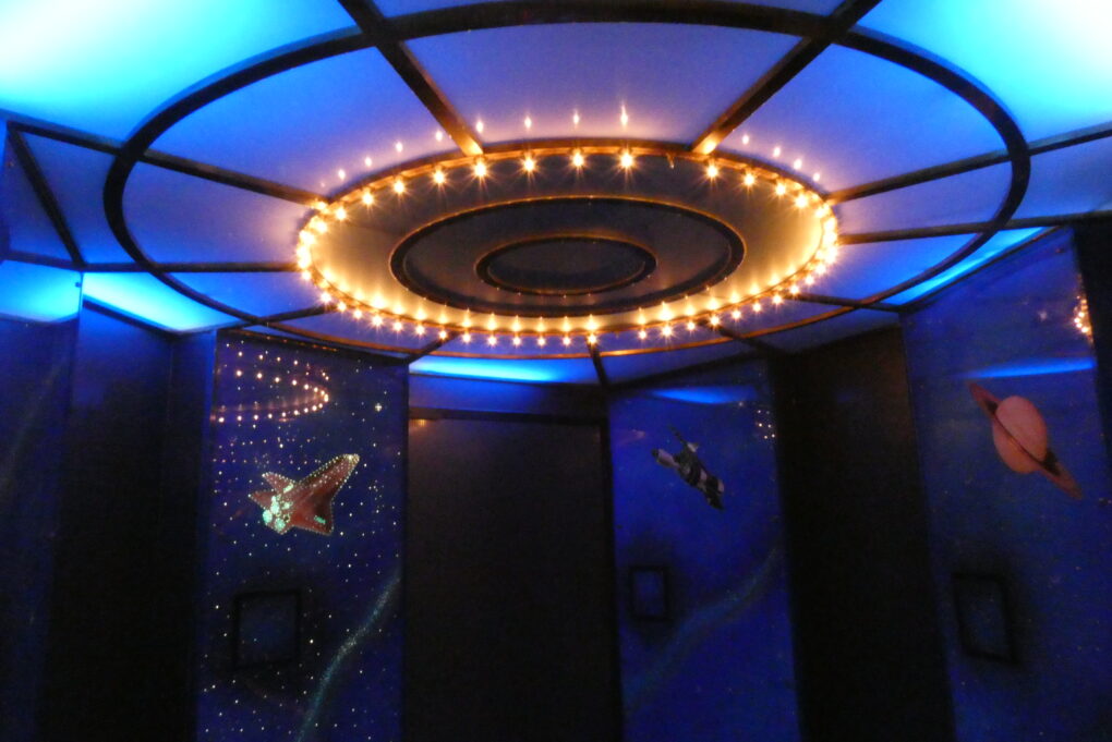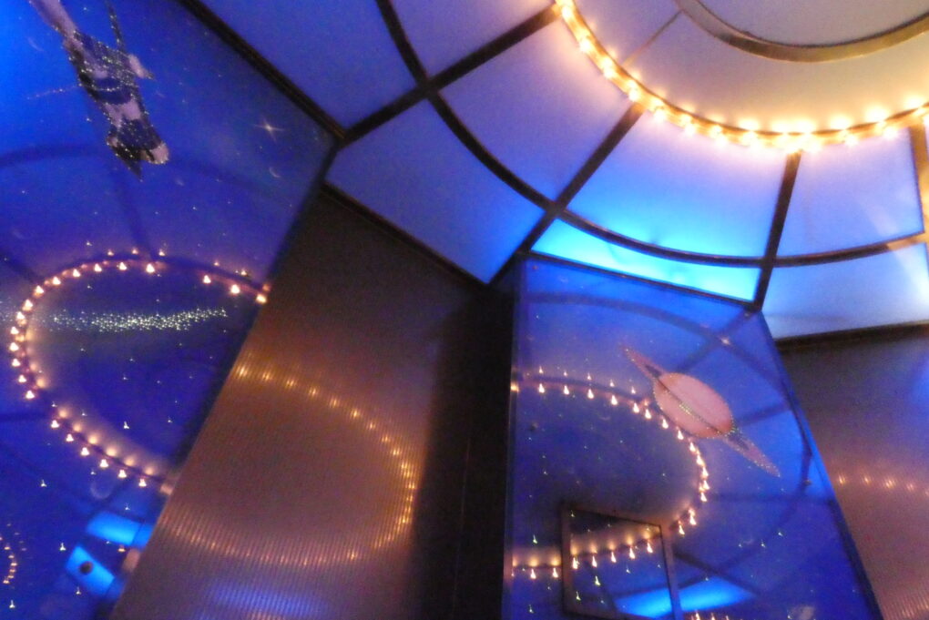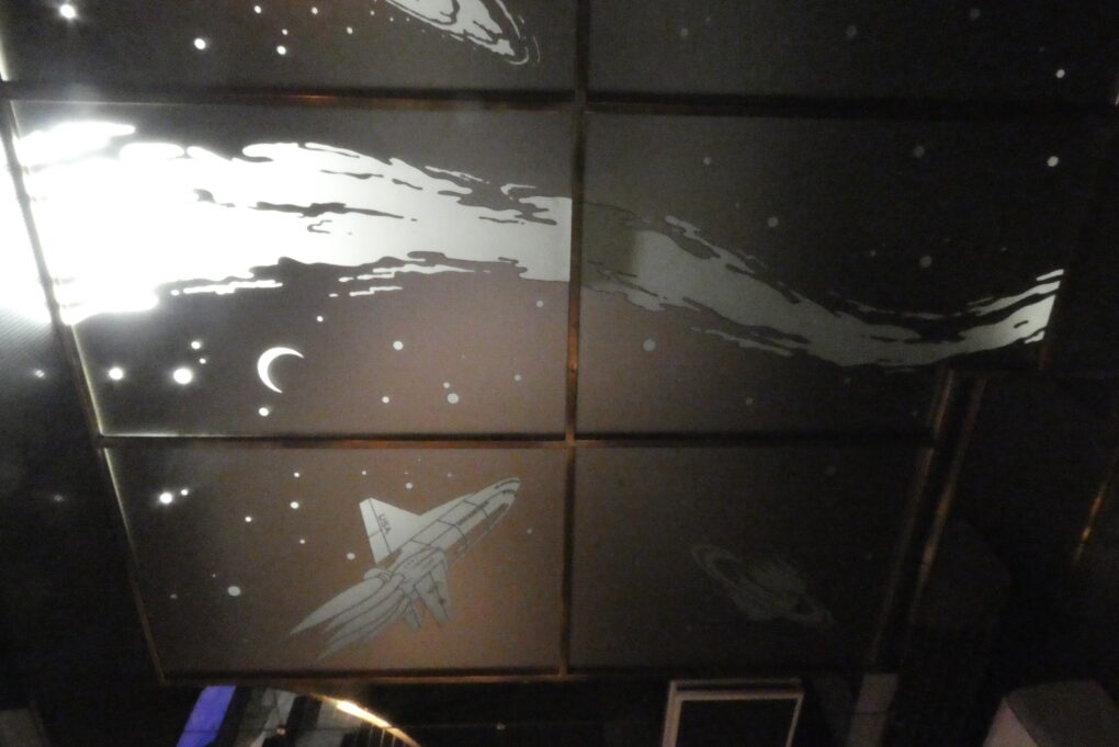 天井には、天の川やスペースシャトル、土星のイラストが描かれている。