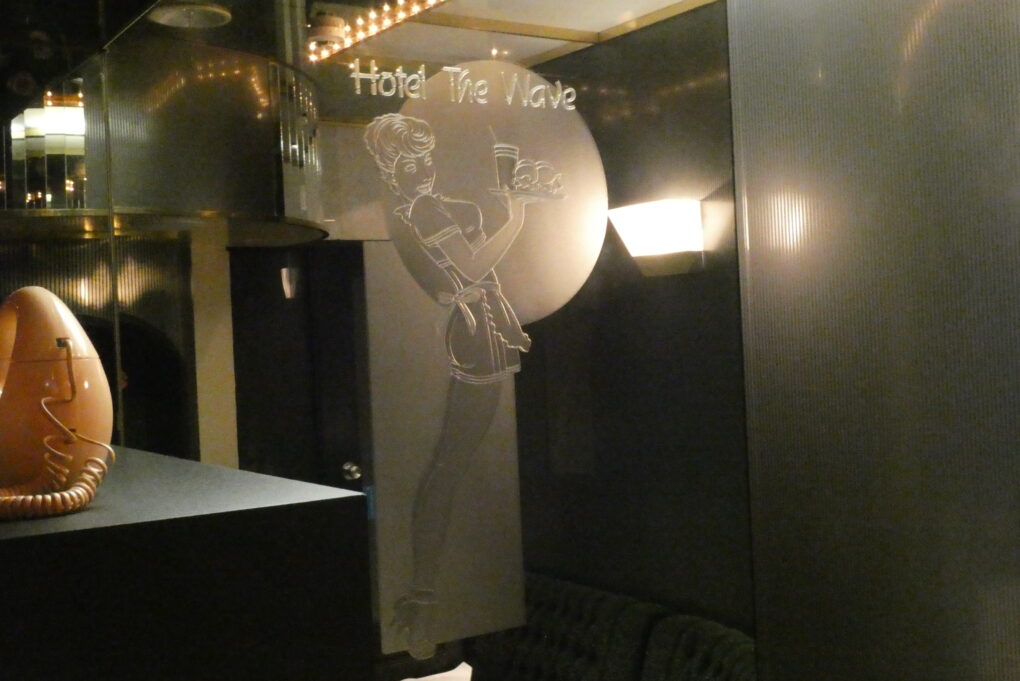ソファとテーブルを囲む壁には、ガラスに立体的に彫られたイラストがある。