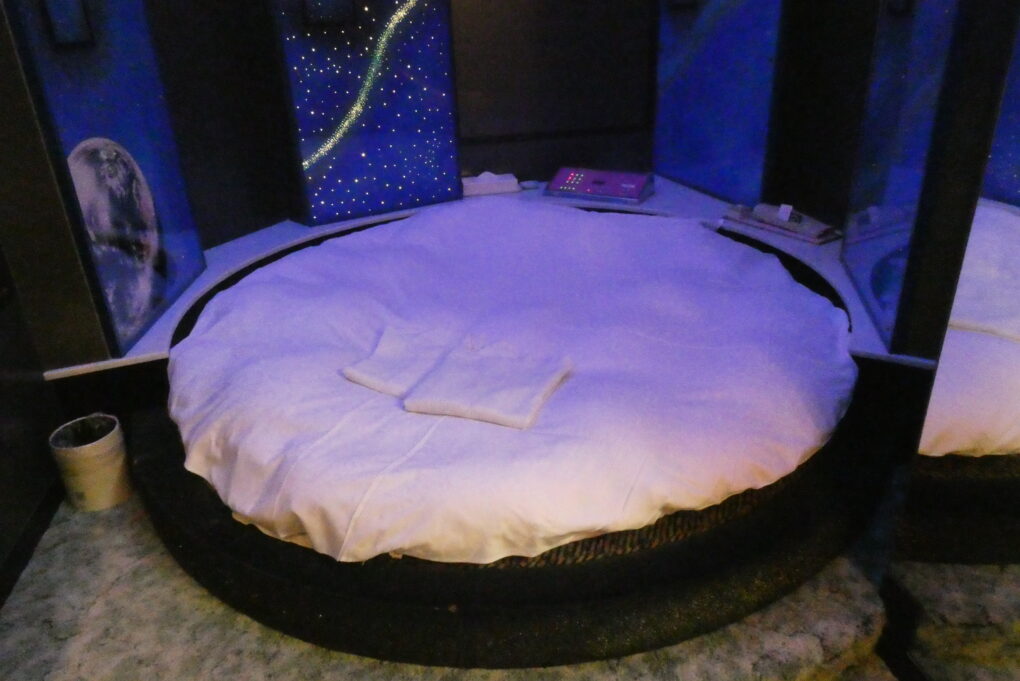 ベッド2台のうちの円形ベッドは、青い光に染まっている。