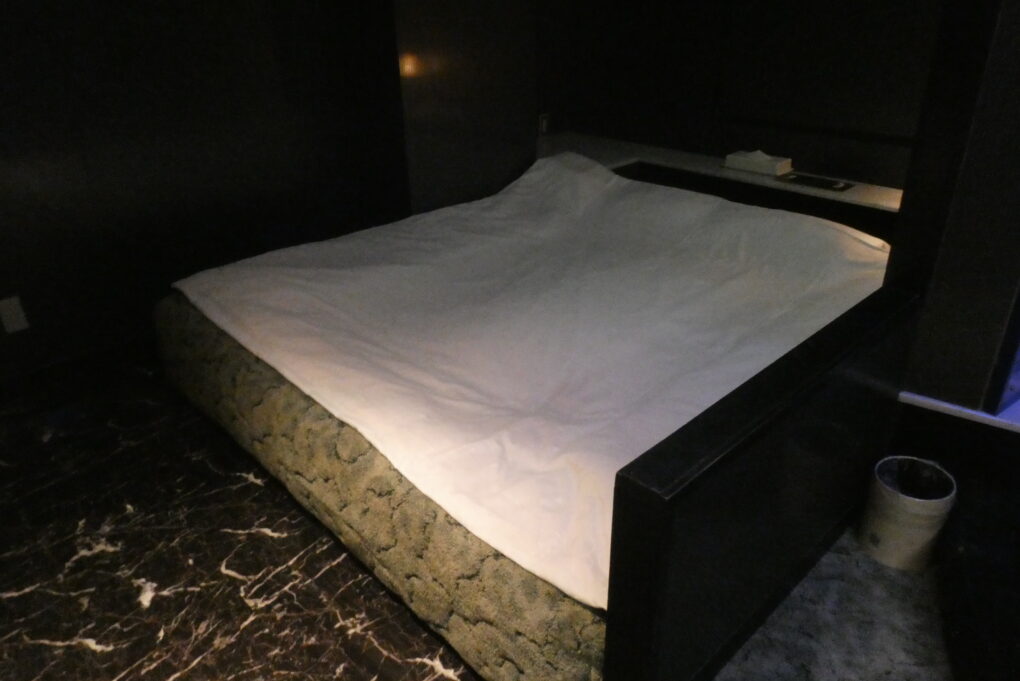 円形ベッドの隣りには、四角いウォーターベッドがある。